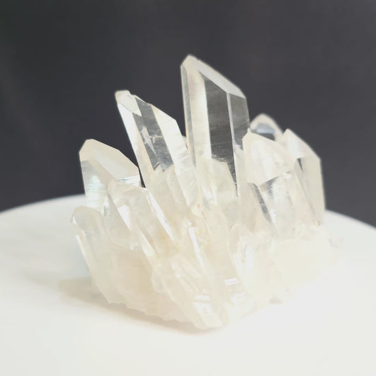 This stunning clear quartz cluster features beautifully transparent, high-luster points rising from a glassback base. It comes from the High Cliff Mine in Arkansas (formerly known as the High Peak Mine), a region world-renowned for producing some of the finest quartz crystals in North America.