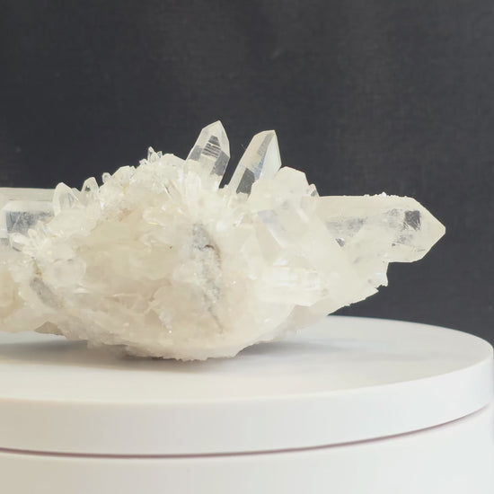 This exceptional clear quartz cluster comes from the historic High Cliff Mine in Montgomery County, Arkansas—formerly known as the High Peak Mine. High Cliff is celebrated for producing brilliant, high-clarity quartz with striking natural formations, making it a prized source among collectors and crystal enthusiasts alike.
