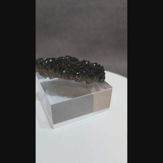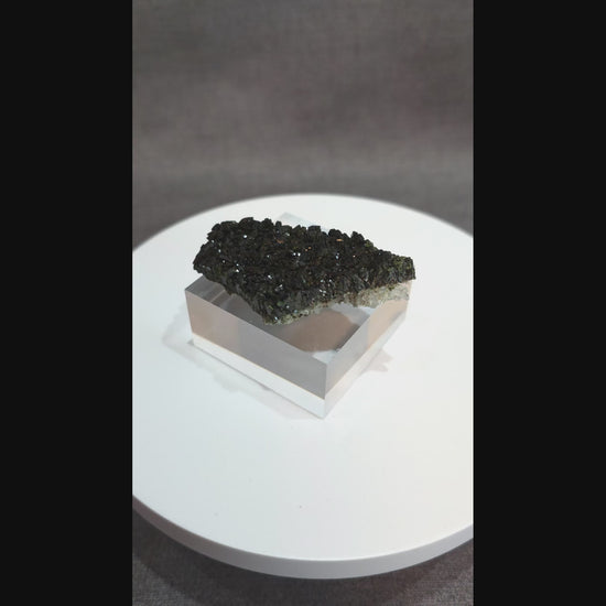 This sleek, display-ready specimen features a sparkling layer of deep green-black Epidote crystals across a broad, naturally sculpted plate. The Epidote blades exhibit sharp, reflective faces that shimmer under light, revealing subtle olive-green undertones beneath their dark surface.