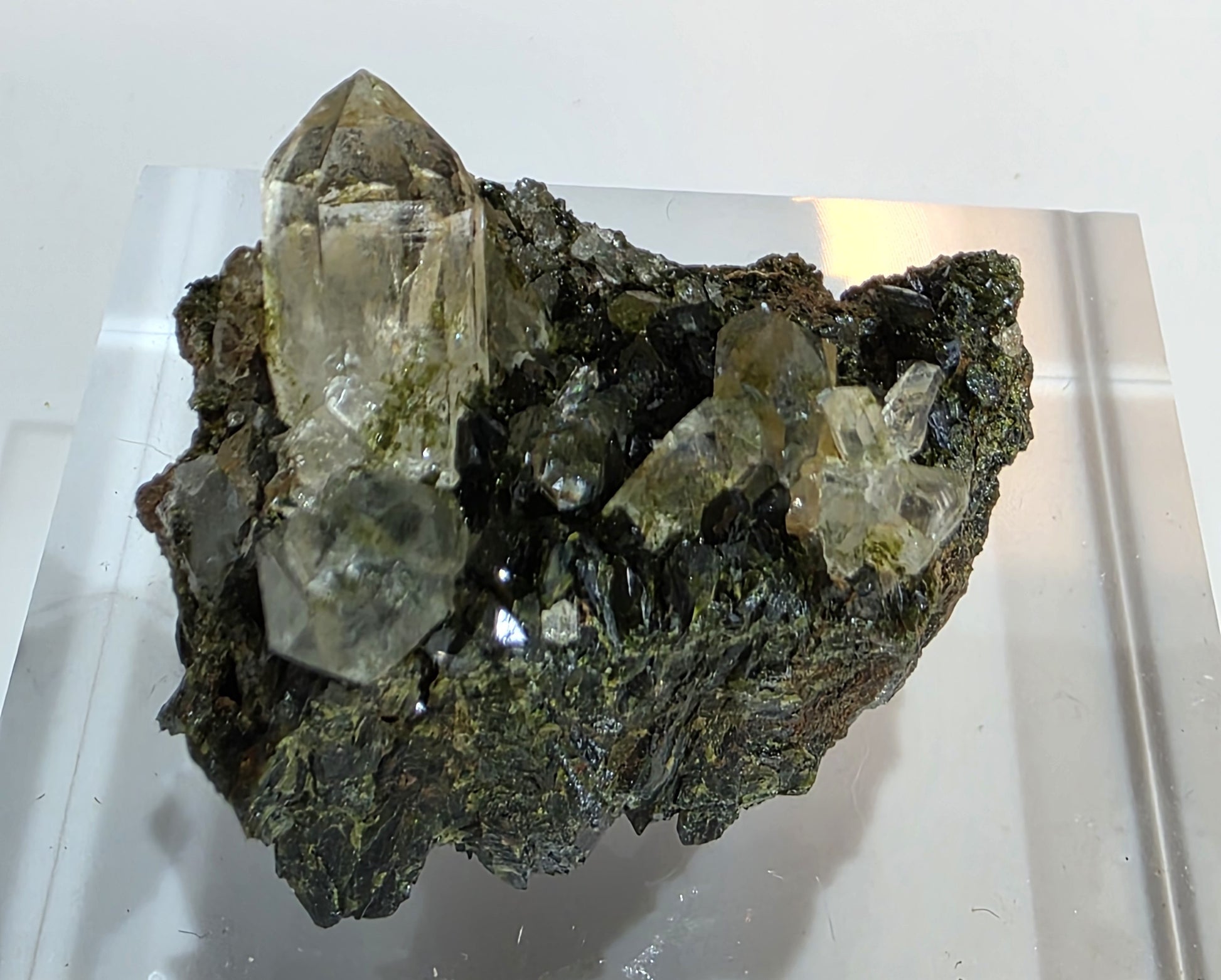 This stunning mineral cluster features bold, well-formed Quartz crystals perched atop a bed of deep green-black Epidote blades. The largest Quartz point boasts exceptional clarity with a subtle golden-green hue, offering brilliant dimension and sparkle from every angle.