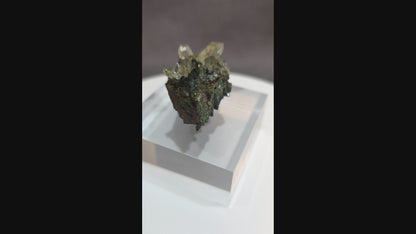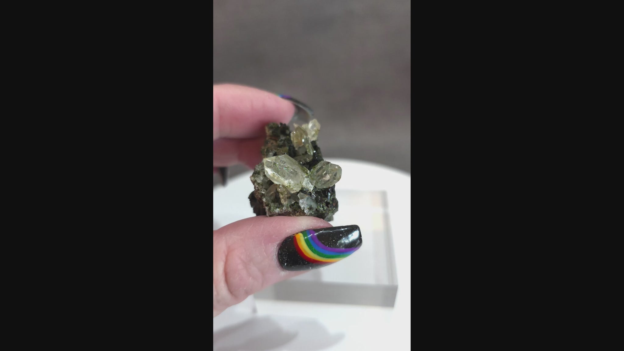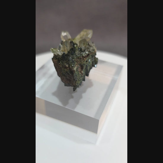 The Epidote below showcases its signature fibrous, lustrous growth, providing the perfect contrast to the translucent Quartz. In addition, the entire bottom of the piece is covered with more of the black epidote blades. This unique combination makes the piece ideal for serious collectors, crystal enthusiasts, or anyone seeking a display with strong earth energy and striking aesthetics.