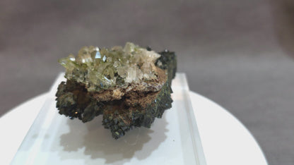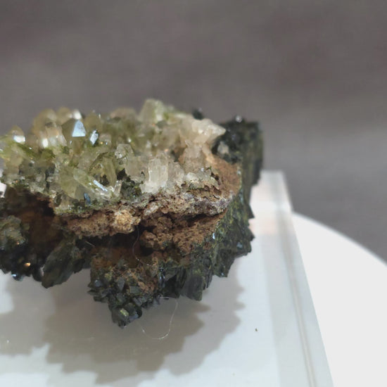 This standout cluster features dense, glassy Epidote crystals in deep green to nearly black hues, accented by a rich crown of Quartz points with golden-green undertones. The Quartz displays a range of well-defined terminations and sparkles beautifully under light, while the Epidote below creates bold texture and contrast.