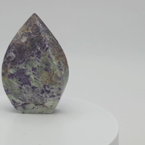 This striking polished flame features swirls of deep purple, green, and earthy tones—a captivating blend of fluorite, fuchsite, diaspore, and zeolite. The natural patterns and colors of this piece evoke a sense of magic and grounding, making it a stunning focal point for your altar, sacred space, or crystal collection.