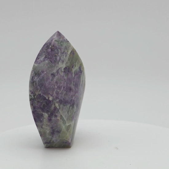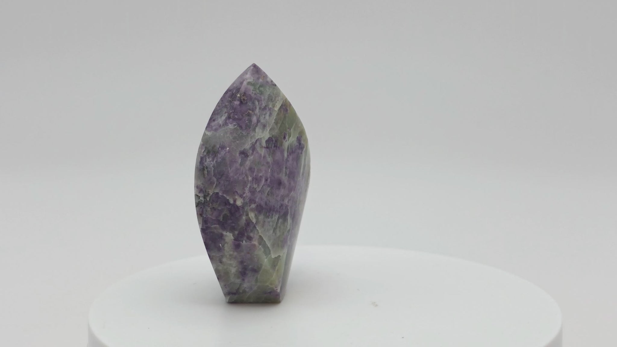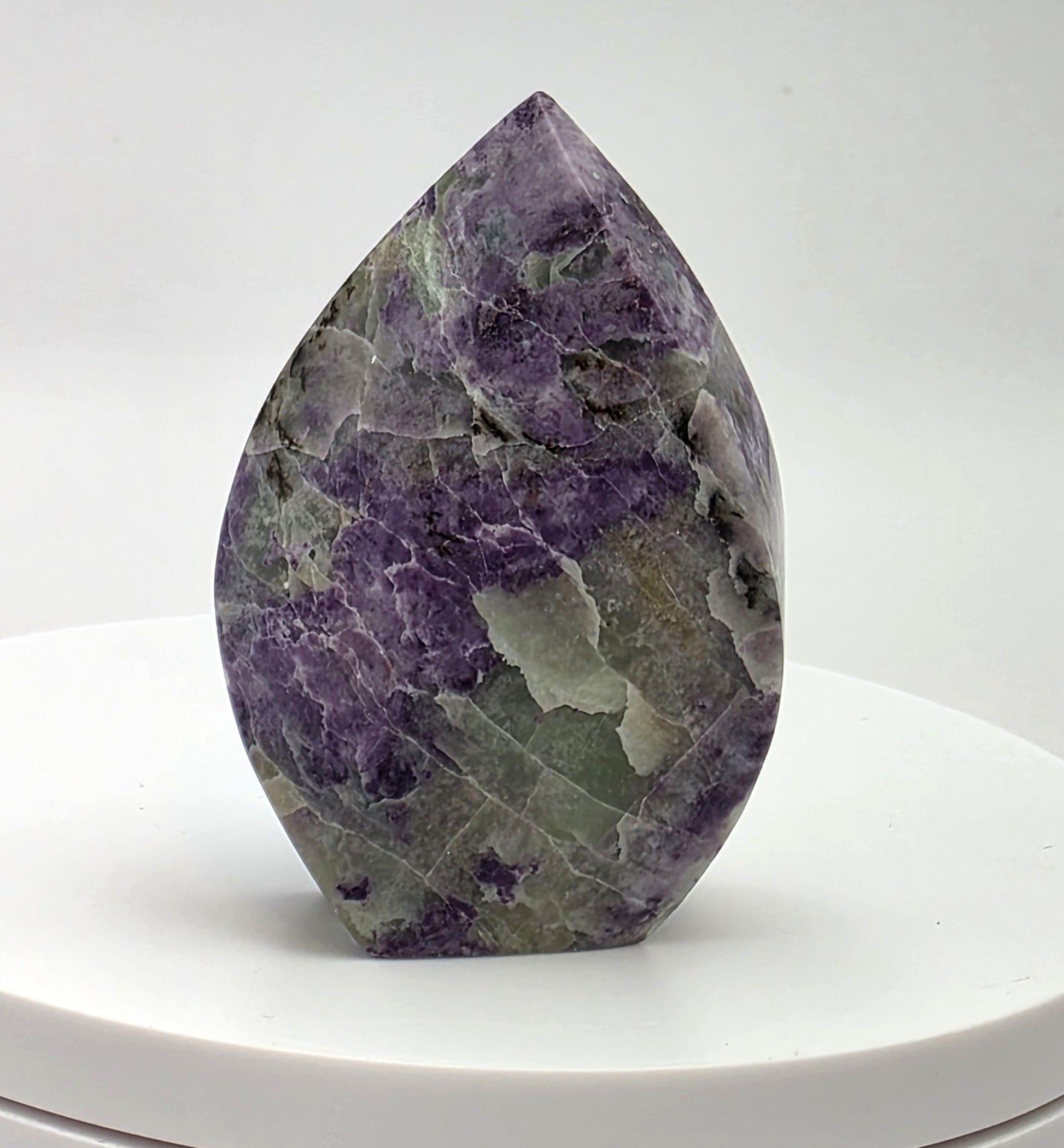 This stunning polished flame features striking natural patterns of deep purple, sage green, and earthy inclusions, showcasing the beauty of Bolivianite—a unique combination of fluorite, fuchsite, diaspore, and zeolite. The graceful flame shape makes it a mystical centerpiece for any altar or sacred space.