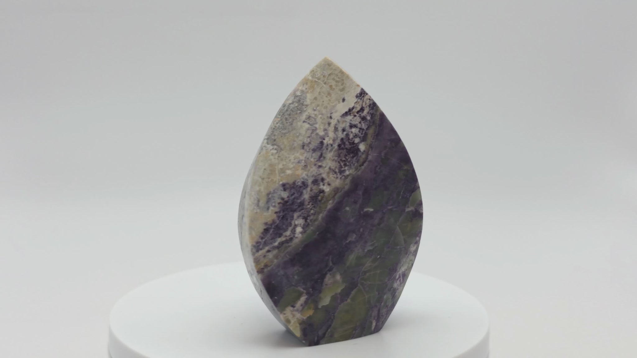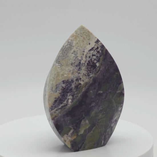 This polished Bolivianite flame reveals a beautiful fusion of rich purples, earthy greens, and soft cream tones in swirling patterns that feel almost enchanted. Its flame shape makes it a captivating centerpiece for any altar, sacred space, or crystal collection.