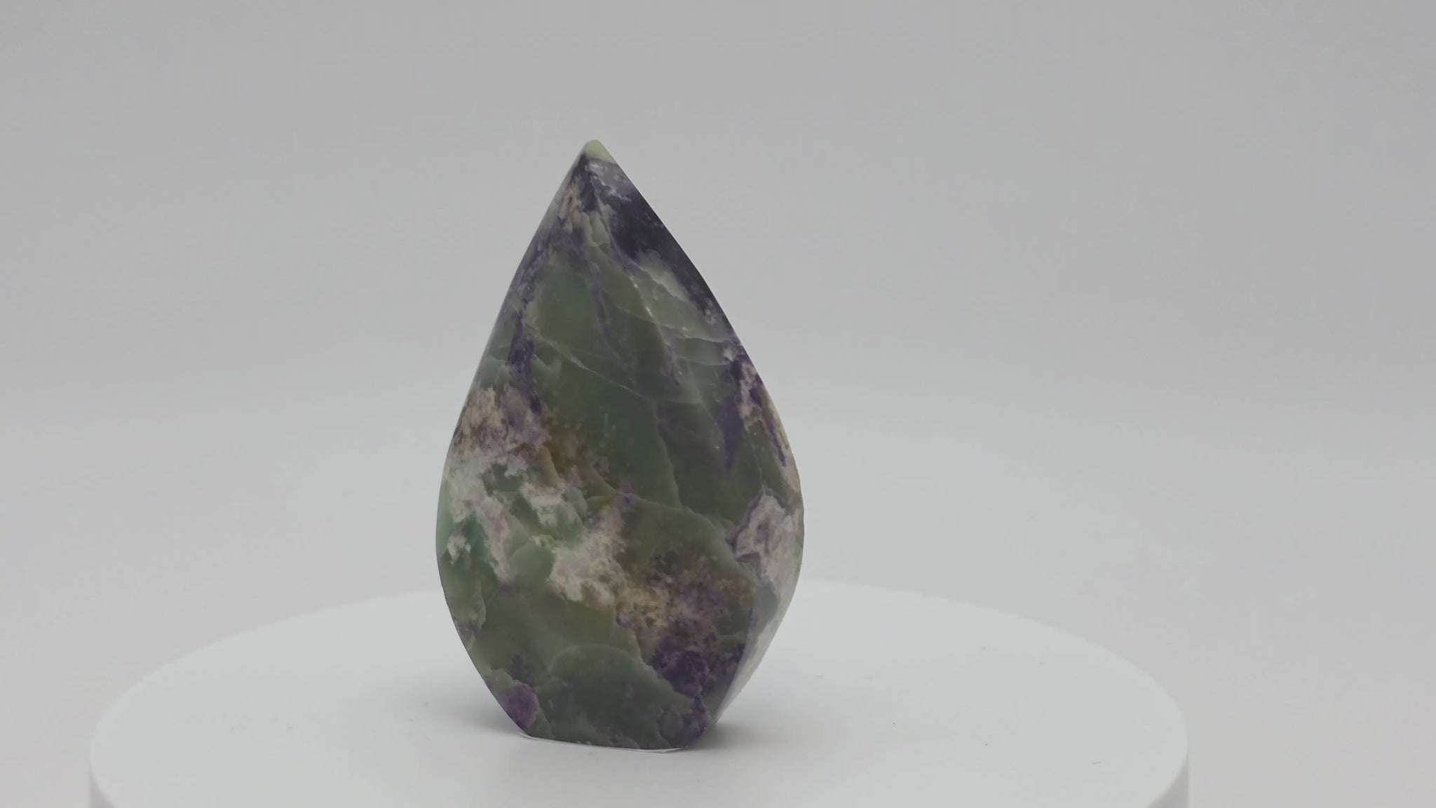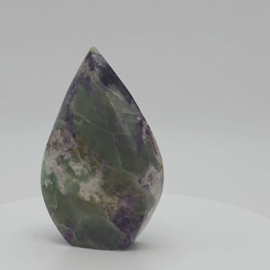 This polished flame features an enchanting blend of mossy greens, deep purples, and earthy textures, a stunning representation of natural Bolivianite. Its unique swirling patterns evoke a sense of ancient magic, making it a captivating piece for any collection or sacred altar.