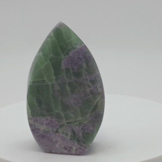 This polished Bolivianite flame displays enchanting layers of deep greens and rich purples, swirling together in a mesmerizing natural pattern. The flame shape makes it an ideal piece for altar work, ritual settings, or as a captivating statement crystal. Its earthy and mystical energy calls to those seeking to deepen their connection to the unseen.
