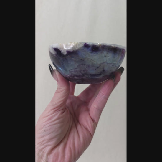 This stunning Rainbow Fluorite bowl is an enchanting display of nature’s artistry. Swirling shades of deep violet, cool blue, and soft white ripple throughout the stone, highlighted by organic inclusions and delicate veining. Its polished surface gleams beautifully while retaining subtle natural textures, inviting you to admire its depth and complexity from every angle — a truly mesmerizing piece to add color and grounding energy to your sacred space.