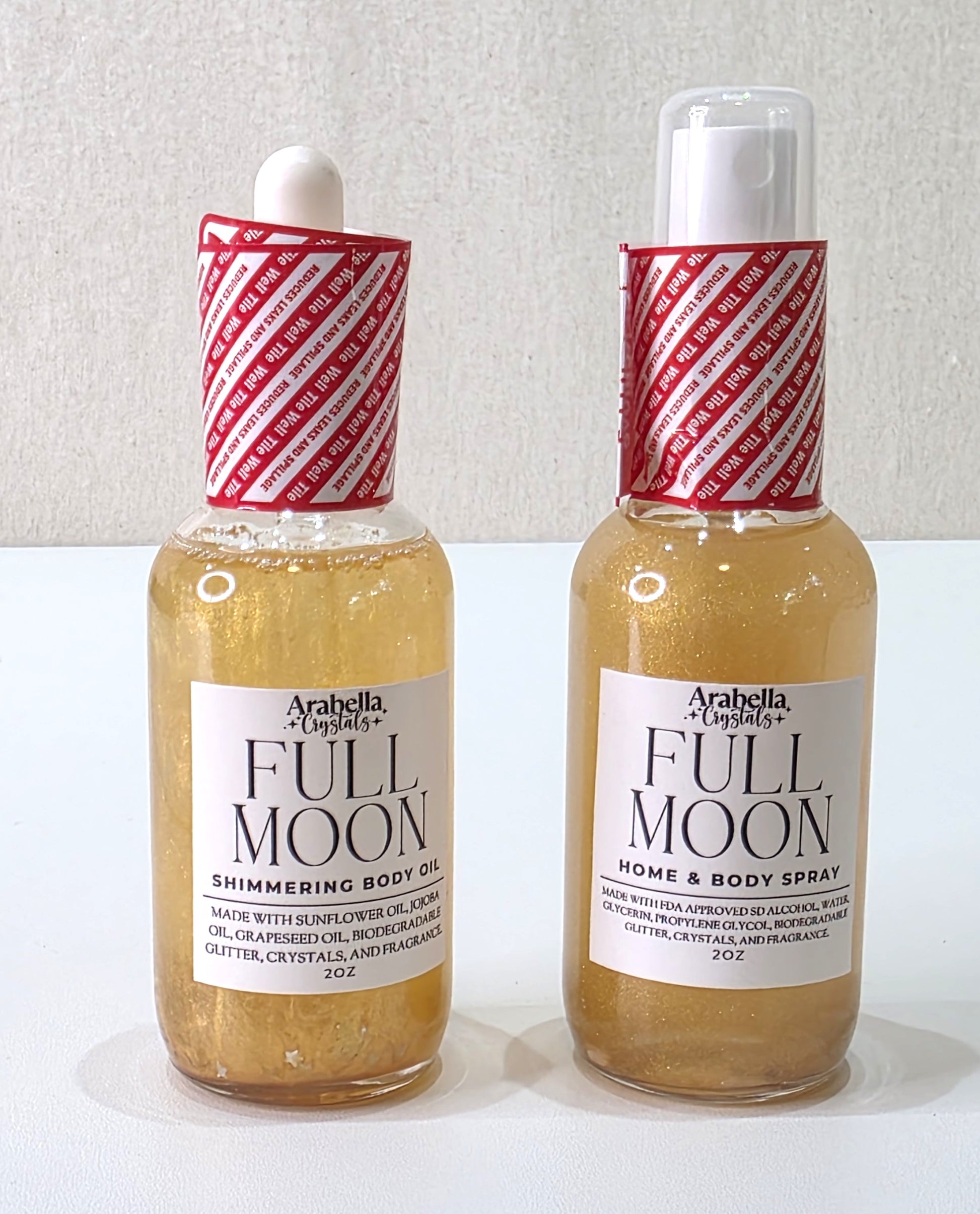 Illuminate your rituals and radiate your intentions with the Full Moon Bundle—a glowing duo crafted to celebrate lunar cycles, amplify manifestation, and channel divine feminine energy. This set features a luxurious shimmering body oil and a coordinating home & body spray, both kissed with moonlight and magical intention.