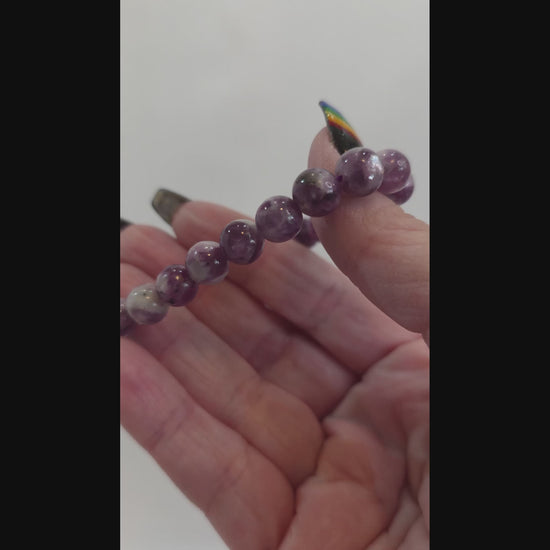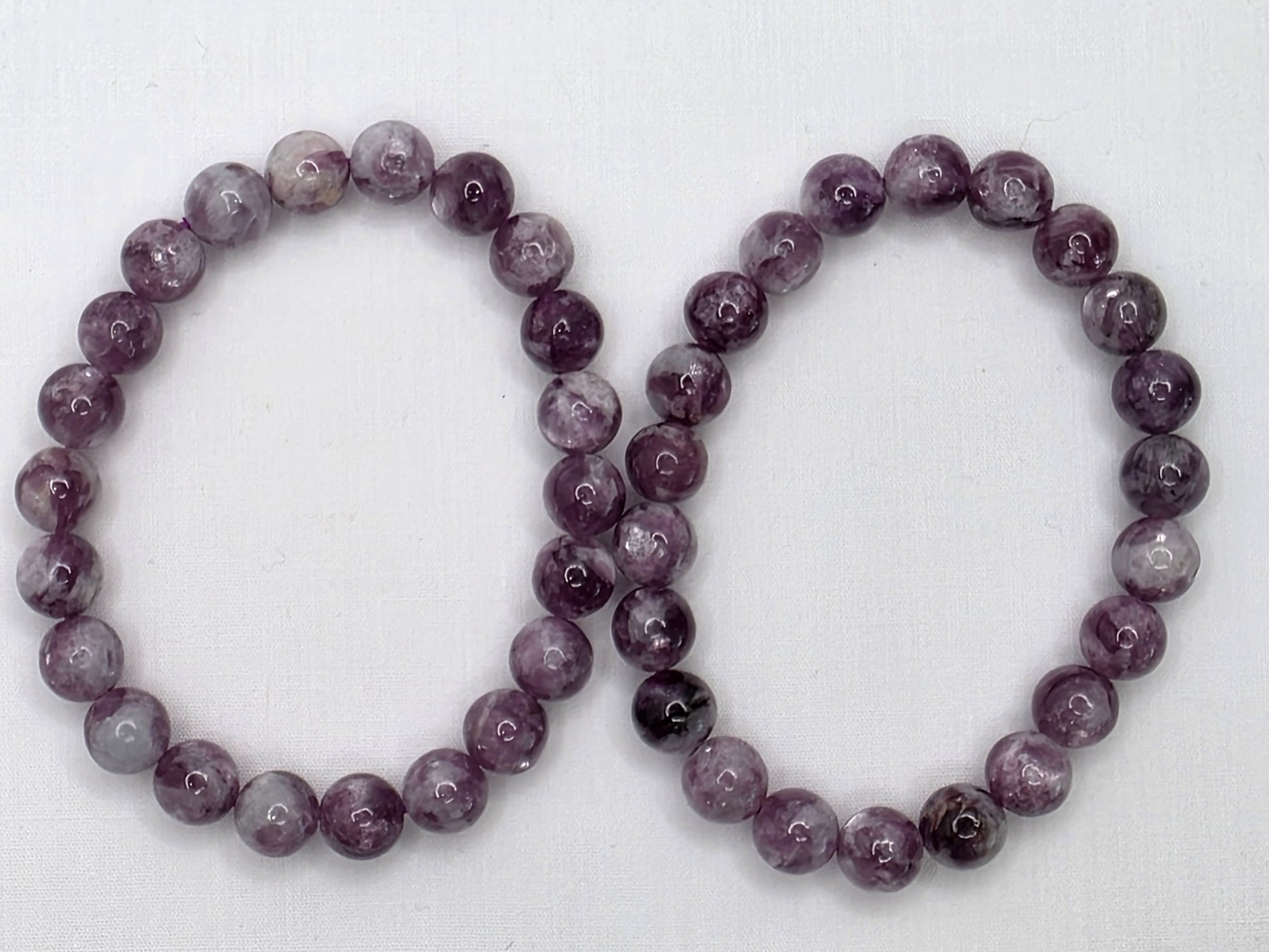 These gorgeous Gem Lepidolite bracelets showcase dreamy swirls of lavender, lilac, and soft gray. Some beads even have a bright flash of mica. Known as the "stone of peace," Lepidolite's soothing energy makes it a perfect companion for calming the mind and embracing emotional balance.