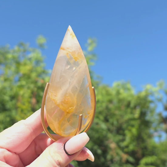 This radiant Golden Healer point is a stunning combination of golden warmth and crystalline clarity. Each piece is shaped into an elegant teardrop form and set in a custom metal stand, creating a sleek and luminous display. Saturated with natural iron oxide inclusions, these crystals shimmer with layers of golden energy that catch the light beautifully from every angle.