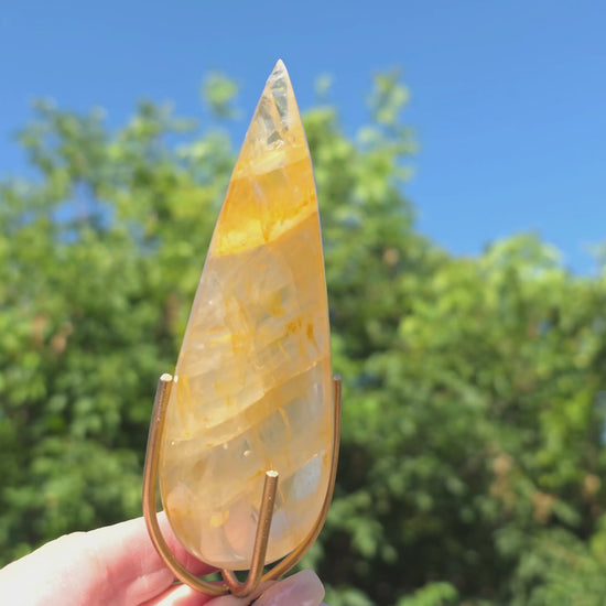This radiant Golden Healer point is a stunning combination of golden warmth and crystalline clarity. Each piece is shaped into an elegant teardrop form and set in a custom metal stand, creating a sleek and luminous display. Saturated with natural iron oxide inclusions, these crystals shimmer with layers of golden energy that catch the light beautifully from every angle.