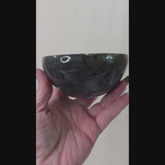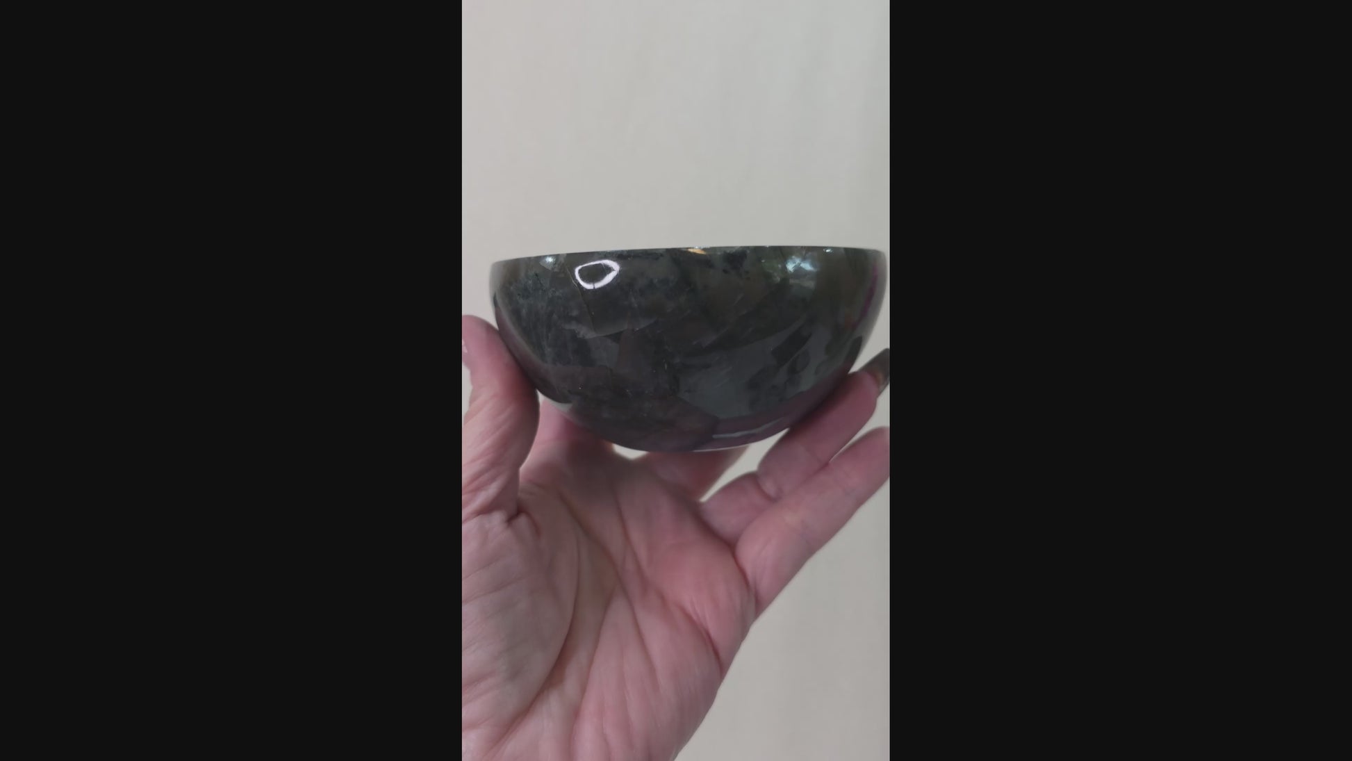 This gorgeous 4-inch polished Labradorite bowl glows with captivating flashes of deep blue and golden labradorescence, creating a truly mystical effect against its smoky dark background. A beautiful addition to any altar, sacred space, or collection.