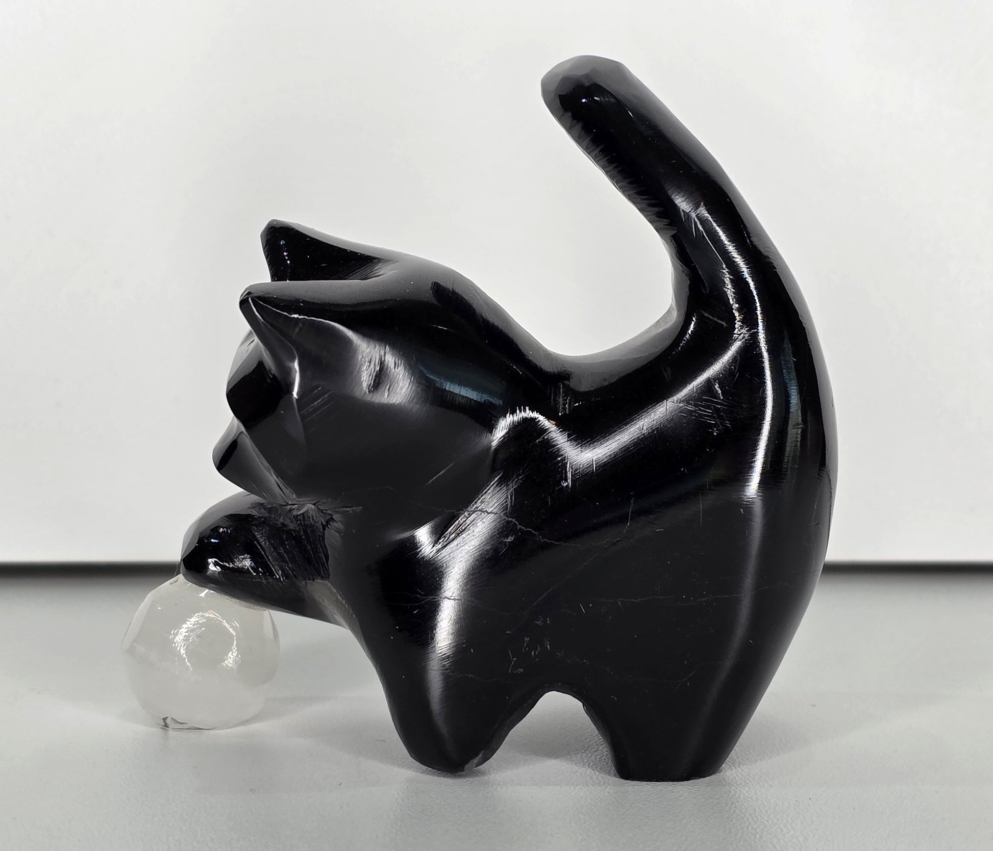 🖤 Black Marble Cat with Yarn Ball – Hand-Carved Figurine