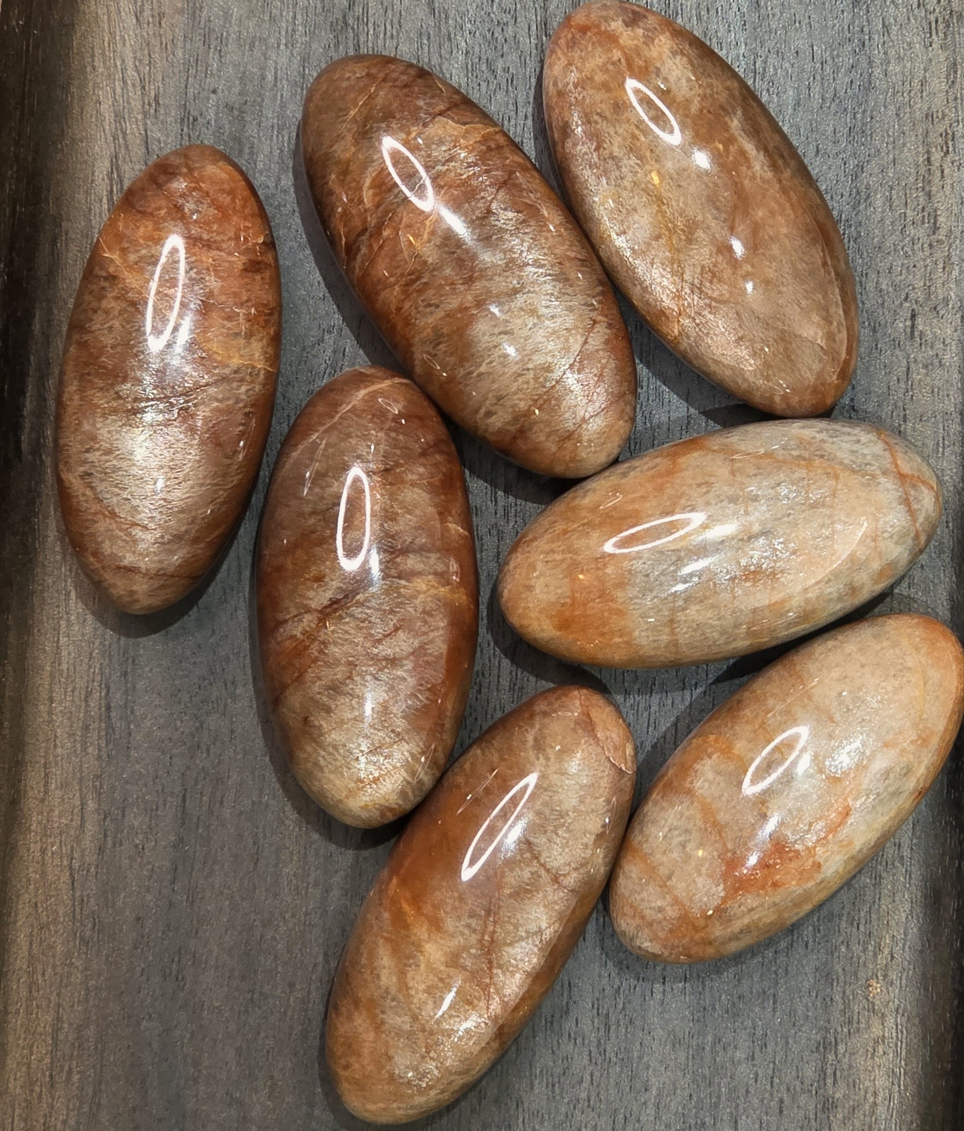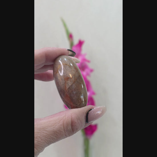 This larger moonstone Shiva lingam showcases rich earthy browns and warm golden undertones, with soft shimmer and layered textures that catch the light beautifully. Its elongated form is perfect for meditation, altar decor, or as a striking statement piece for grounding energy.