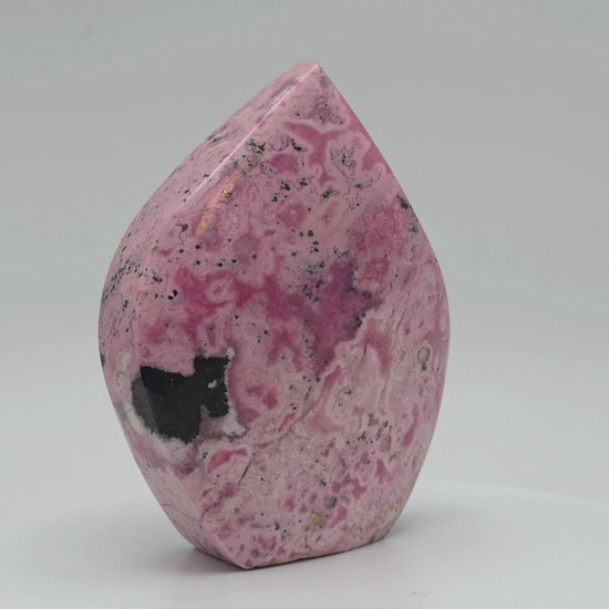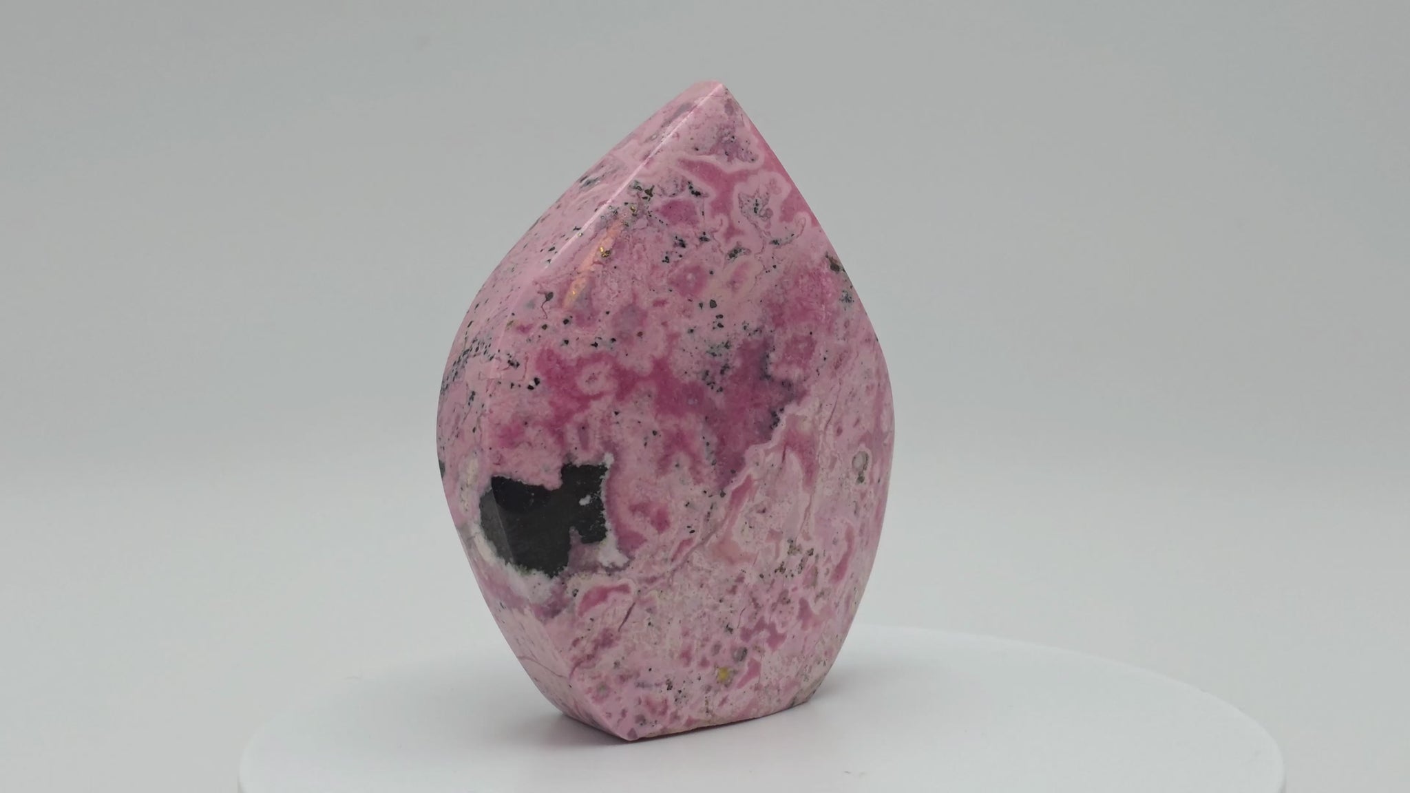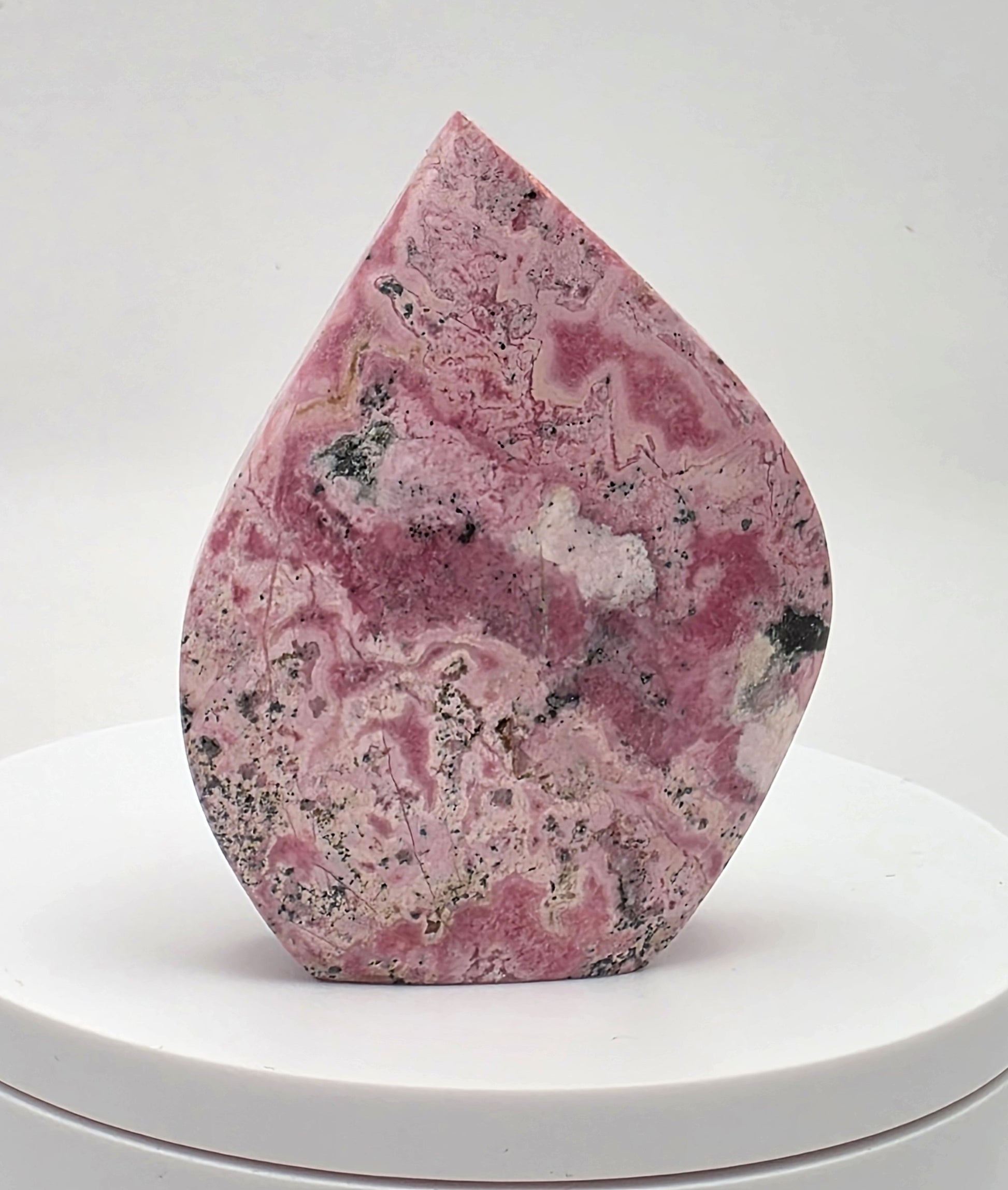 This beautiful polished flame features striking pink hues and natural black veining, characteristic of premium Peruvian rhodonite. The graceful flame shape makes it an eye-catching centerpiece for any crystal collection, altar, or sacred space.