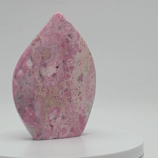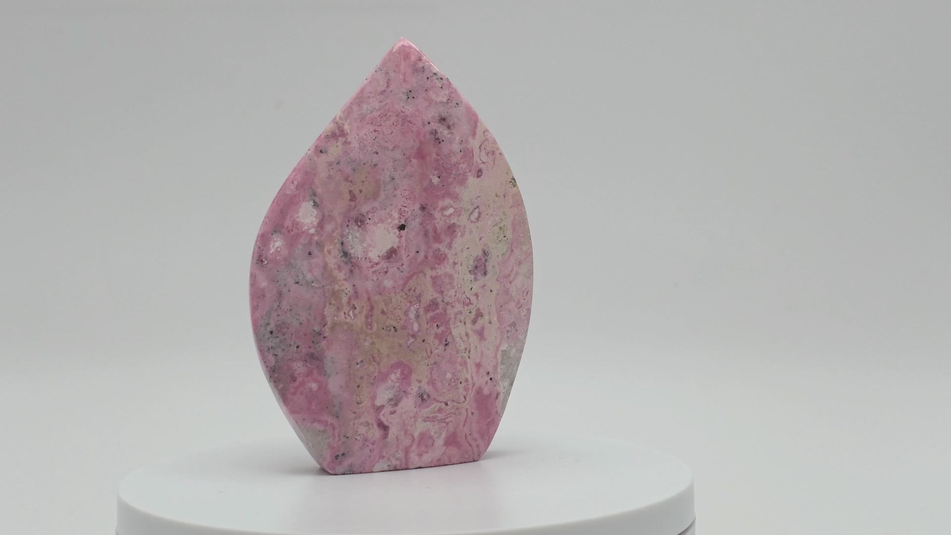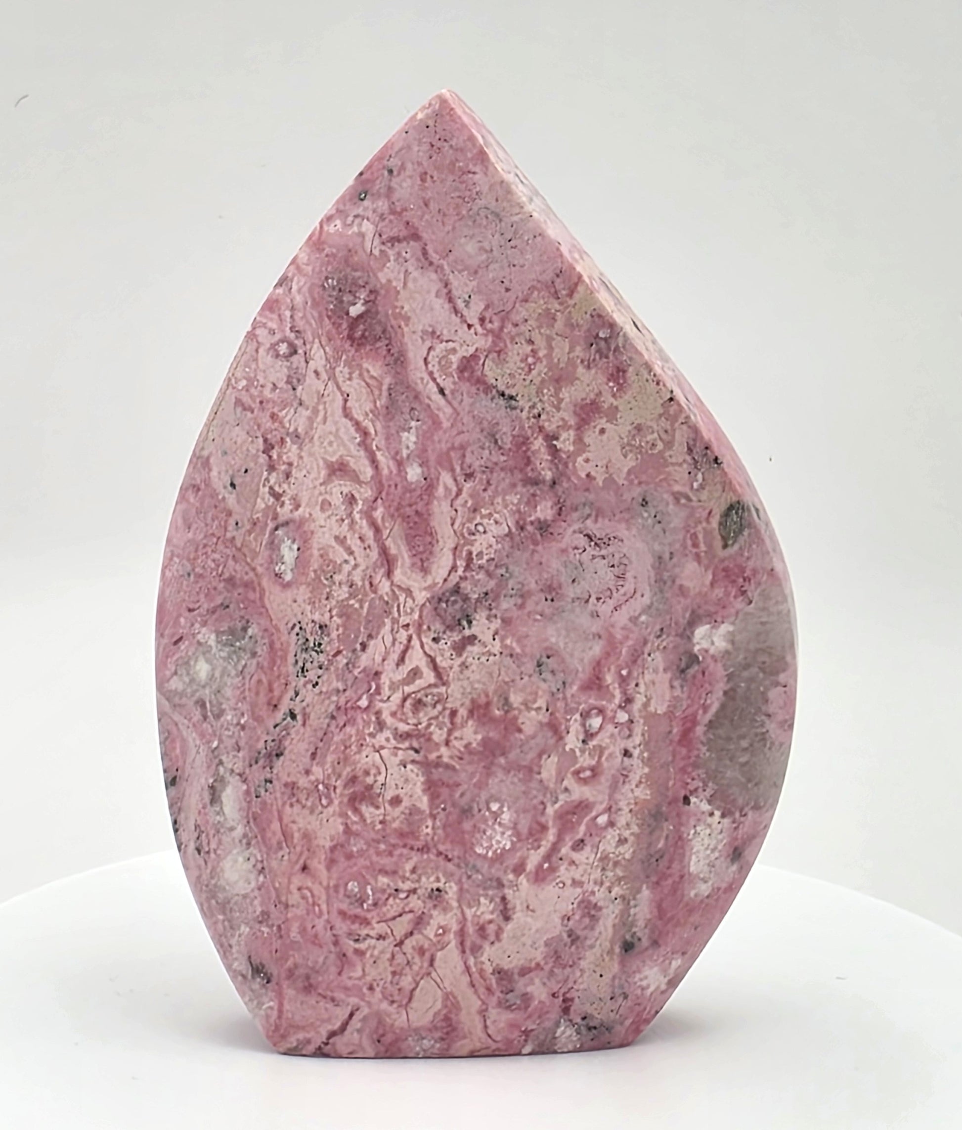 This beautiful polished flame features rich pink and black hues characteristic of high-quality Peruvian rhodonite. Its striking coloration and elegant flame shape make it a perfect centerpiece for any crystal collection, altar, or display.