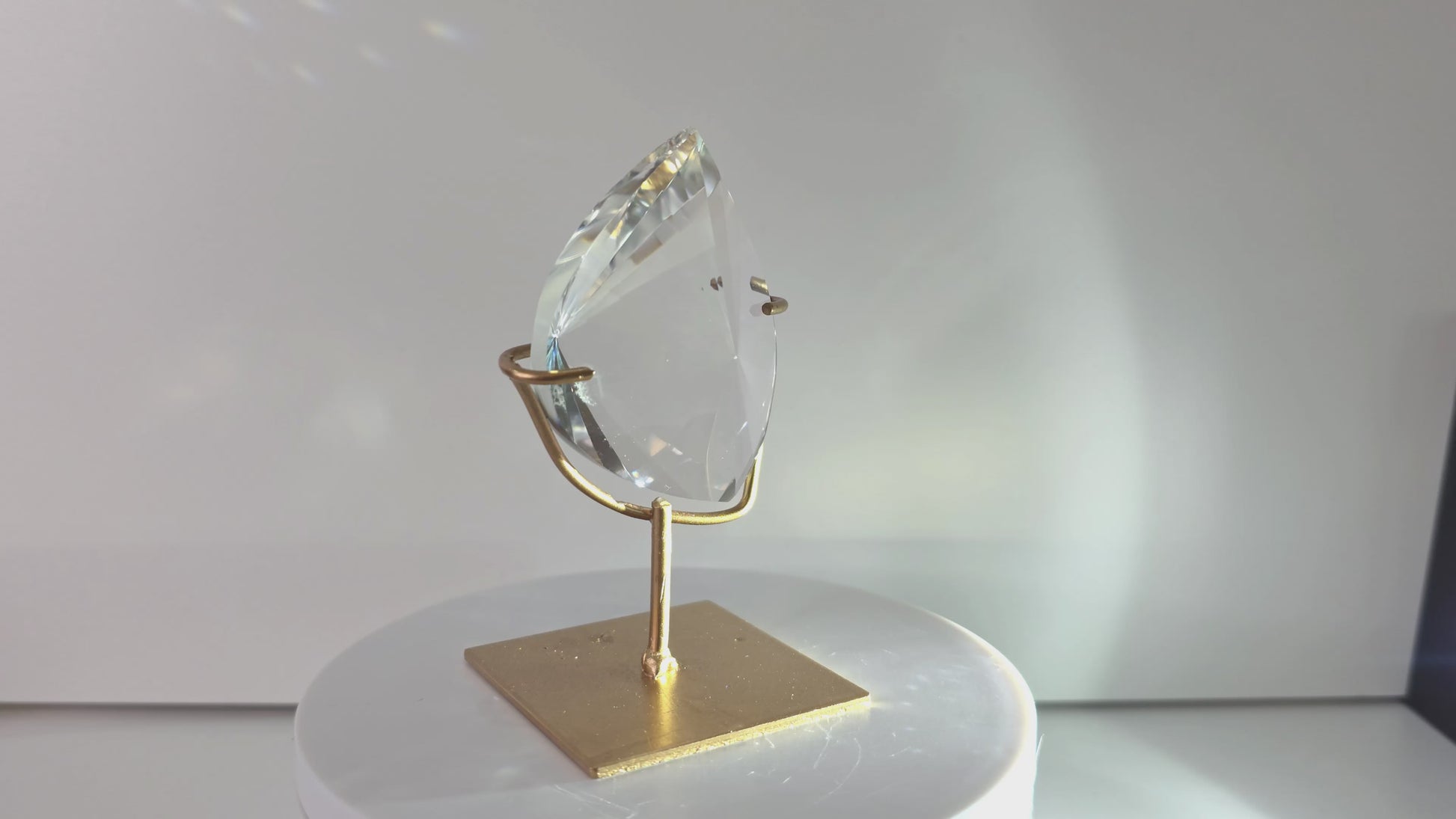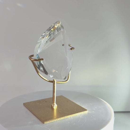 This stunning Lemurian crystal has been masterfully cut and polished into a brilliant diamond shape, held elegantly by a golden metal stand. Sourced from Brazil, this high-clarity piece is a modern interpretation of ancient energy—marrying sacred geometry with spiritual resonance. Its prismatic facets shimmer in natural light, casting rainbows and reflections that make it a true centerpiece.