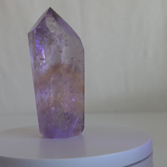 This stunning amethyst tower features internal flashes of golden-yellow powellite phantoms that come alive under UV light. While soft and subtle in daylight, this piece reveals a hidden world of fluorescence—perfect for collectors who crave something magical and rare. A gem for any crystal lover, metaphysical practitioner, or science enthusiast.