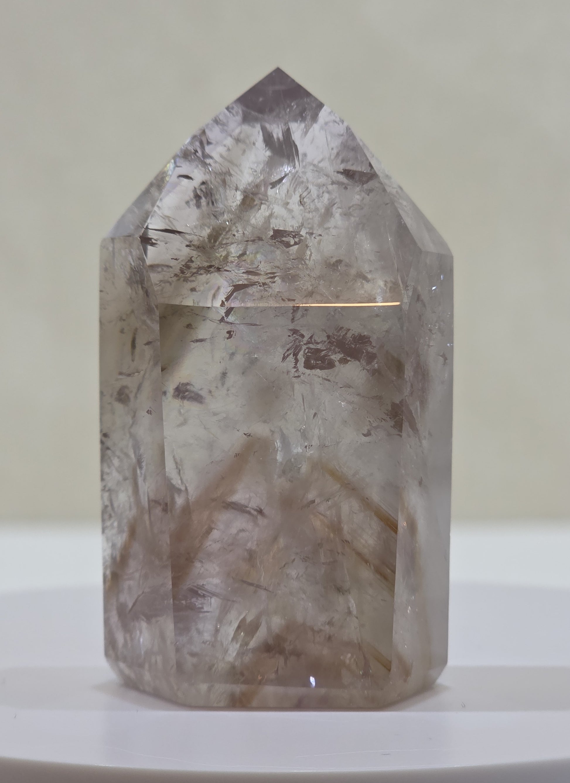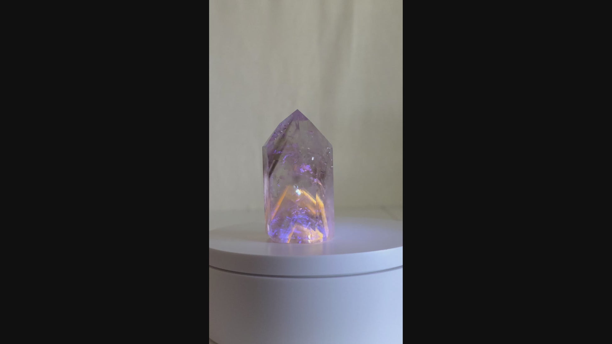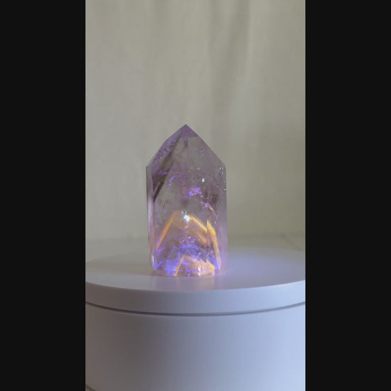 This striking polished point showcases rare Powellite inclusions suspended in high-clarity Brazilian amethyst. Under normal light, the golden-brown powellite threads create a captivating network of internal detail—but under UV light, these inclusions glow brilliantly, revealing their hidden fluorescence and adding an ethereal dimension to the piece.